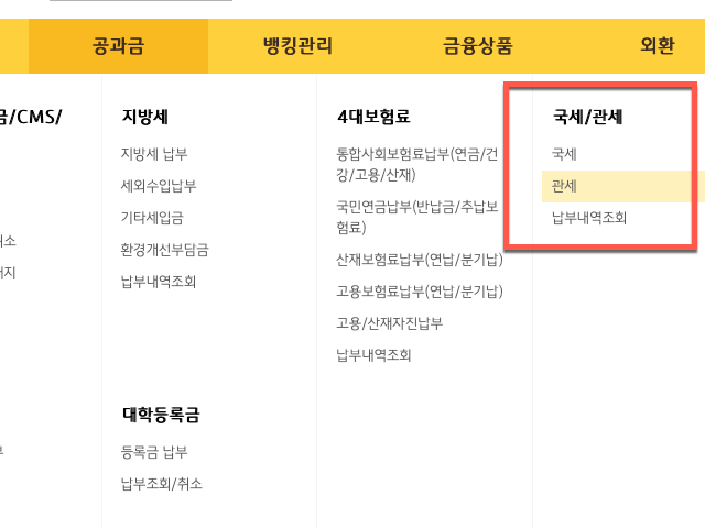 <공과금> 대 메뉴 아래에 있는 목록 중에 우측에 있는 <국세/관세> 항목에 있는 <관세> 가 우리가 필요한 납부 메뉴입니다