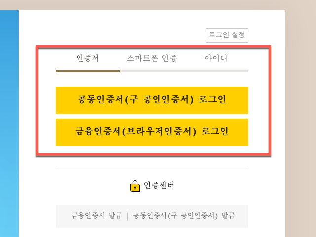 로그인 방법은 구 공인인증서에서 제도와 이름이 변경된 <공동인증서> 나 스마트폰으로 간편하게 활용할 수 있는 <금융인증서> 의 로그인 방법을 선택 로그인하시면 됩니다