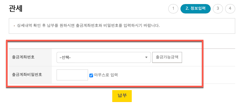 2번째 정보 입력 단계에서는 조회된 정보와 납부할 금액을 확인하셨다면 출금할 계좌 선택과 통장 출금 비밀번호 4자리를 입력합니다
