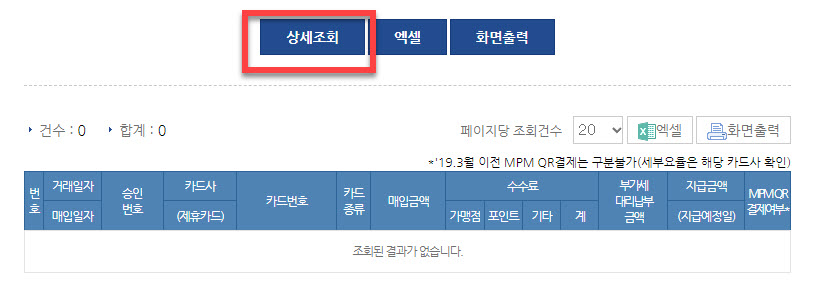 매입이 있었던 일자 기간을 설정하여 조회하면 해당 일자의 매입 건수와 매입금액 그리고 수수료에 대해서도 표시되어 확인할 수 있습니다
