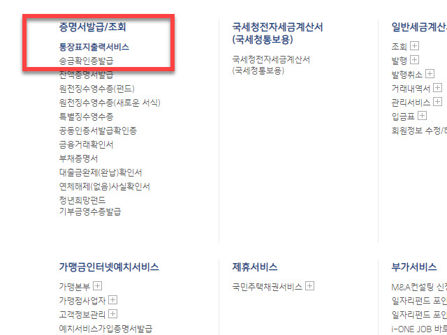 해당 목록 중에서 좌측에 있는 <증명서발급/조회> 항목 밑에 있는 <통장표지출력서비스> 가 우리가 오늘 필요한 서류 중에 하나인 <통장사본> 을 준비할 수 있도록 서비스를 제공하는 항목입니다