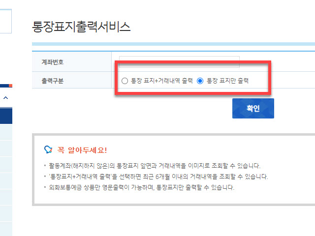<통장표지 출력 서비스> 를 클릭 이동하셨다면 통장 사본이 필요한 <계좌번호> 를 선택 후 <출력구분> 항목에서는 거래내역이 필요 없기 때문에 <통장 표지만 출력> 을 선택 후 파란색 <확인> 버튼을 클릭해 주시면 됩니다