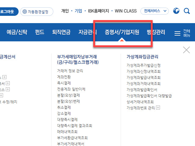 로그인을 완료하셨다면 개인인터넷 뱅킹 고객과는 다른 기업뱅킹 고객에게 필요한 서비스가 배치되어 있는 메뉴 목록 중에서 <증명서/기업지원> 으로 마우스를 움직이면 하위에 있는 가려져 있던 많은 메뉴가 표시됩니다