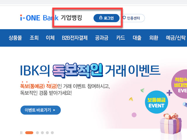 기업은행 사이트 주소로 방문을 하면 그림에 있는 <뱅킹로그인> 버튼으로 마우스 커서를 이동하여 개인뱅킹과 기업뱅킹을 선택 이동할 수 도 있지만, 가장 간단한 방법은 메뉴 상단에 있는 <기업뱅킹> 텍스트 메뉴 링크를 사용하여 이동하시는 것이 쉽습니다
