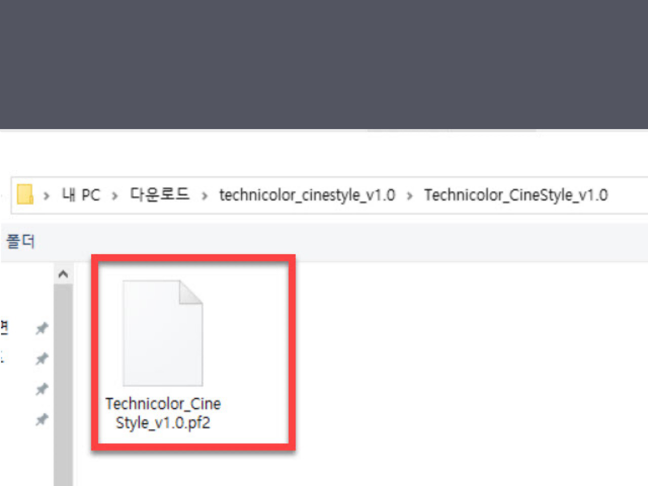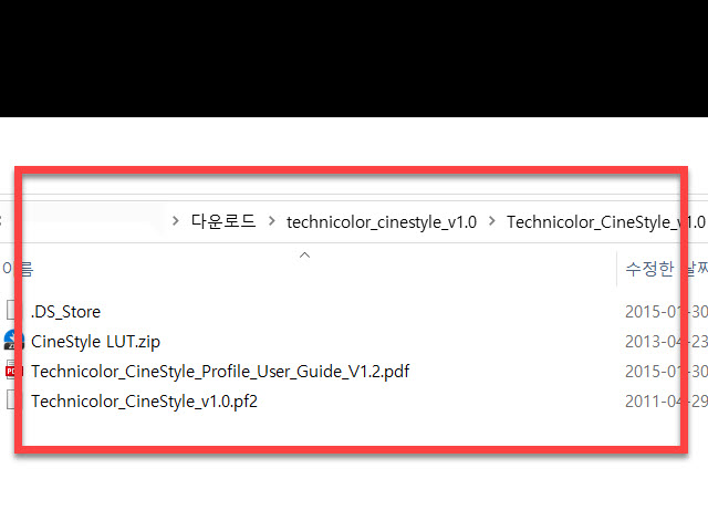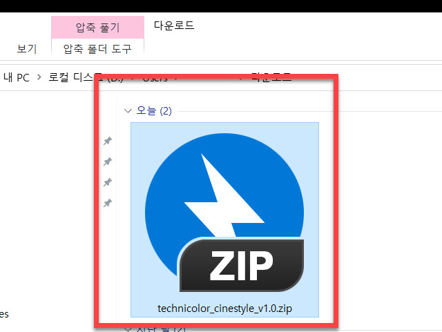 압축되어 있는 technicolor cinestyle v1.0.zip 파일명을 가지고 있는 압축파일이 있는 폴더로 이동한 다음,