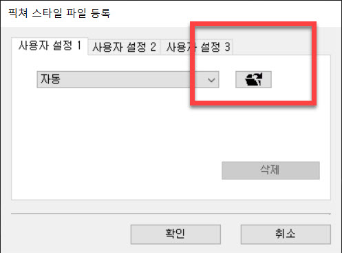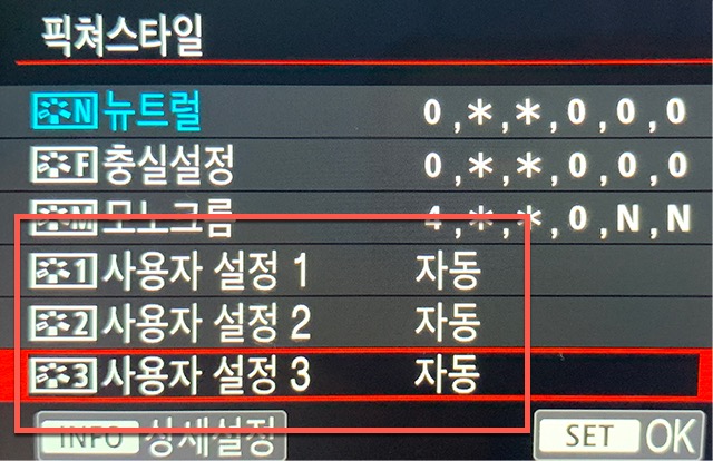 표준사진(Standard), 인물사진(Portrait), 풍경사진(Landscape), 뉴트럴(Netural), 충실설정(Faithful), 모노크롬(Monochrome) 등의 기본 제공되는 픽쳐스타일 들 외에 3개의 사용자 설정이 있음을 확인할 수 있습니다