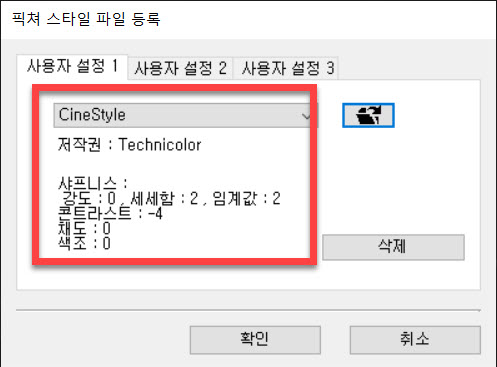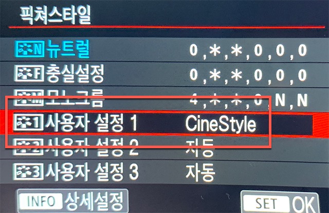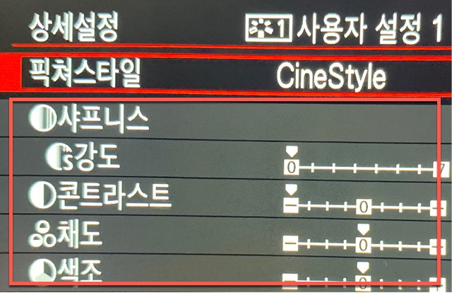이오스 유틸리티를 사용하여 PC에서 픽쳐 프로파일을 전송한 다음에는 그림과 같이 사용자 설정1에 <CineStyle> 의 Picture Style 이 추가된 것을 확인할 수 있습니다
