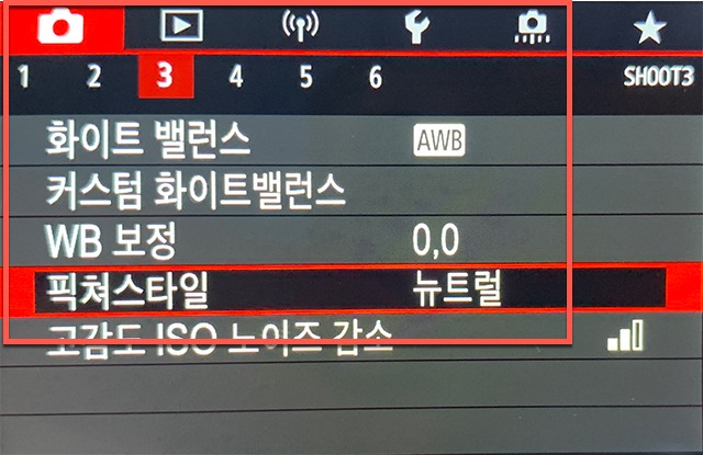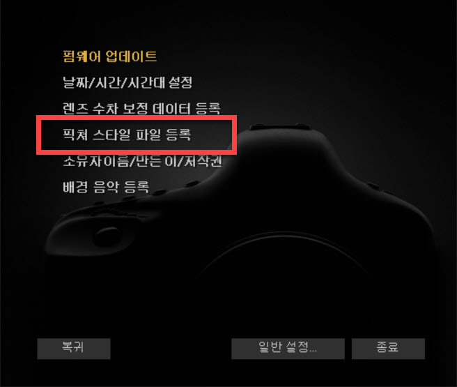 먼저 설치하기 전 Canon Camera 본체의 메뉴에 있는 <픽쳐스타일> 항목을 찾아봅니다