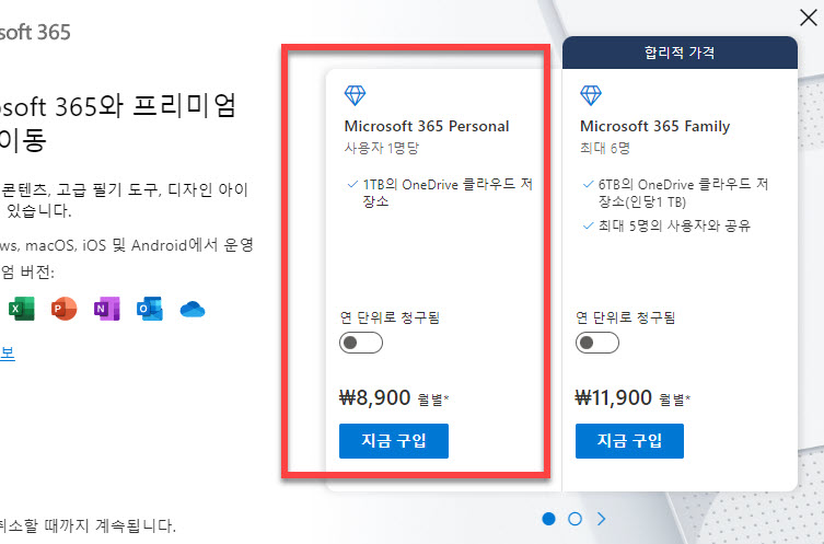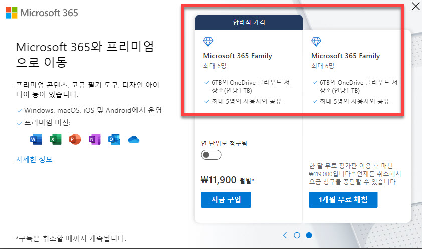 그리고 최대 5명의 사용자와 공유할 수 있는 Microsoft 365 Family 요금제는 1달에 11,900원의 비용 지불로 구매할 수 있습니다
