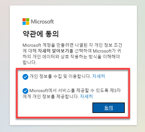계정 만들기 위해서는 Microsoft 의 개인 정보 수집 및 이용 그리고 서비스를 제공할 수 있도록 제3자에게 개인정보 제공에 대한 약관에 대한 동의가 필요합니다