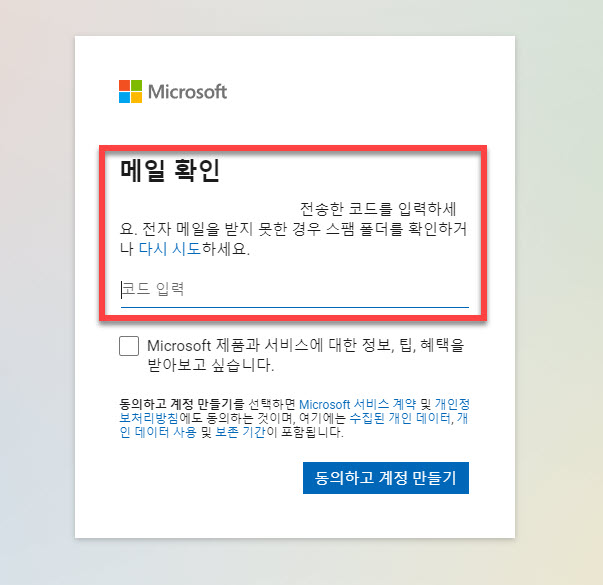 회원가입 시 등록한 이메일 주소로 조금 전 MS에서 메일 확인용으로 발송한 이메일 내용에 있는 코드를 확인하여 그림에 있는 <코드 입력> 칸에 동일하게 기입해 주신 후 <동의하고 계정 만들기> 버튼을 눌러주시면 됩니다