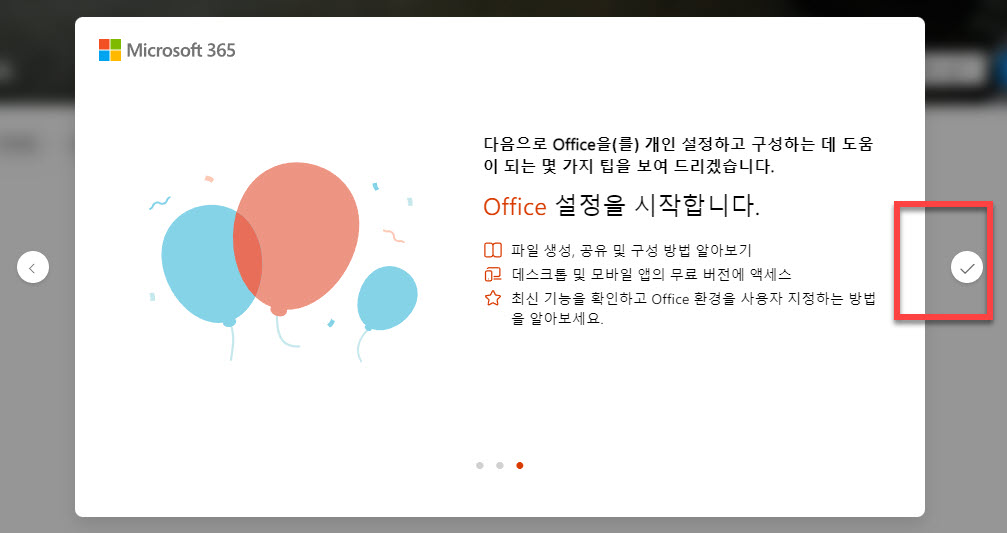 3번째 페이지의 기본적인 정보까지 살펴보셨다면 우측에 있는 체크표시를 선택하여 본격적으로 필요한 MS 응용 소프트웨어를 이용할 수 있습니다