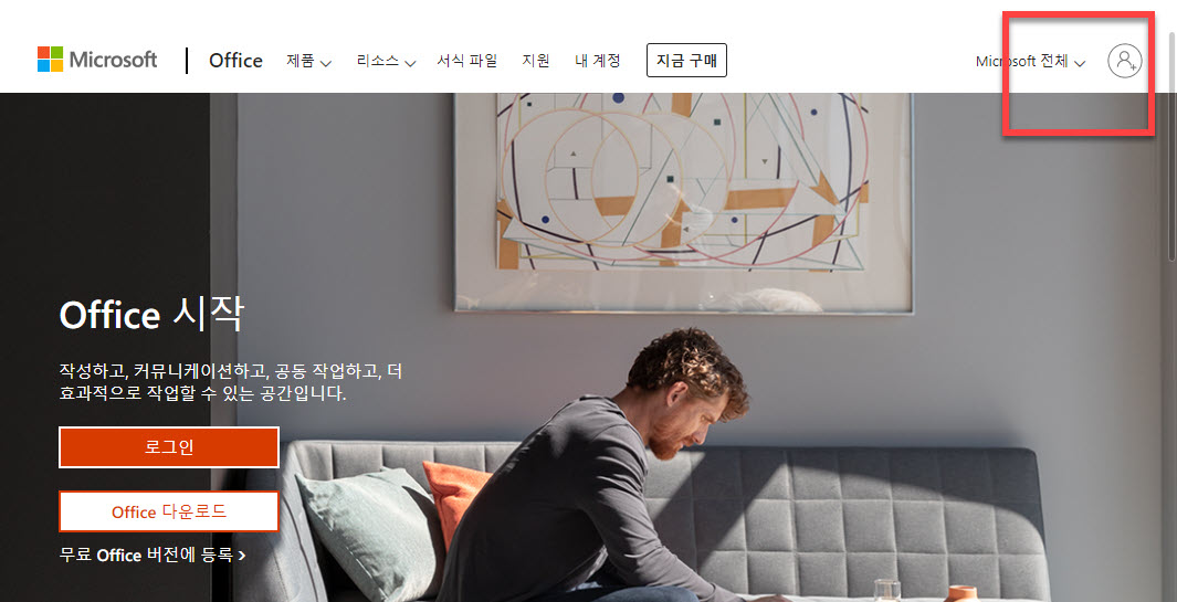 무료로 파워포인트, 엑셀, 워드, 아웃룩 윈노트를 사용하기 위한 로그인 전에 꼭 필요한 회원가입 단계 진행을 위해서는 홈페이지 오른쪽 상단에 있는 해당 영역의 아이콘을 마우스로 선택하여 작업을 시작해야 합니다