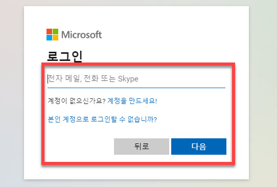 아직은 로그인에 필요한 전자메일, 전화 또는 Skype 입력 영역에 정보가 없기 때문에 우리는 먼저 아래에 있는 <계정이 없으신가요? 계정을 만드세요!> 의 텍스트 링크를 클릭하여 회원가입 과정으로 넘어가야 합니다