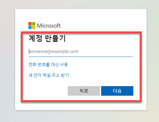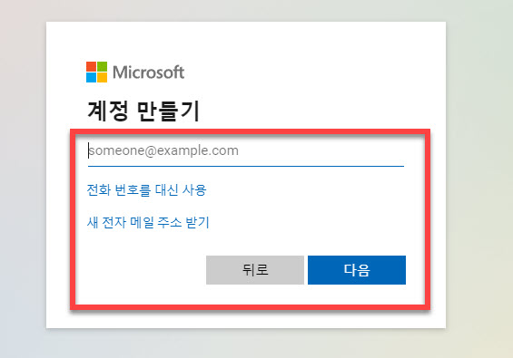 <계정 만들기> 단계에서는 네이버, 카카오, 다음, 구글 Gmail 등의 기존에 이용자가 사용하고 있는 이메일 주소를 사용하려는 분들은 “someone@example.com” 에 입력을, MS에서 제공하는 이메일 주소를 새롭게 제공받으면서 시작하려는 분들은 아래에 있는 <새 전자 메일 주소 받기> 를 선택하시면 됩니다