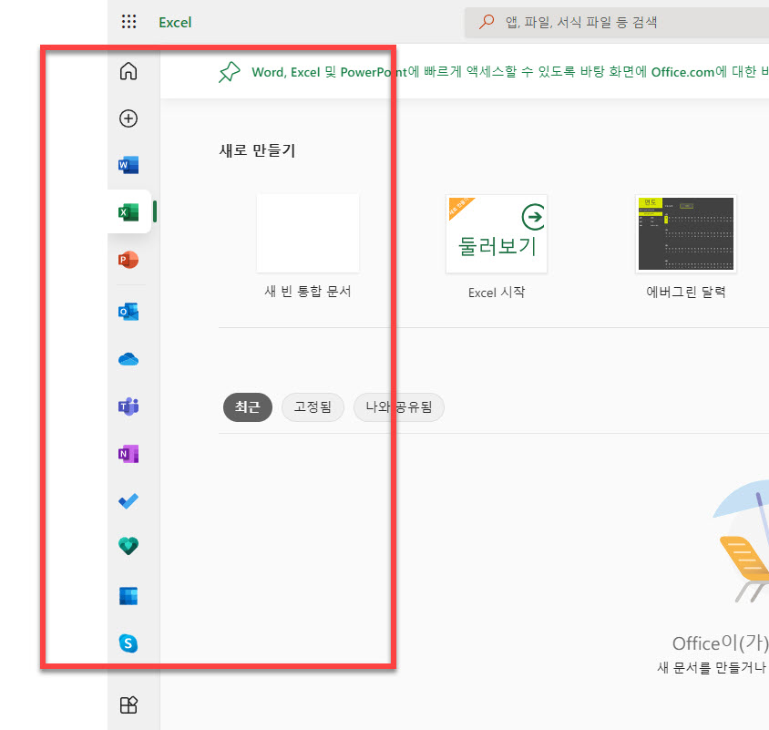 시작 페이지의 좌측 영역에서는 인터넷이 연결된 환경에서 접속할 수 있는 웹에서 사용할 수 있는 MS의 엑셀, 워드, 파워포인트 외에도 다양한 응용 앱을 사용할 수 있도록 세로로 배치가 되어 있습니다
