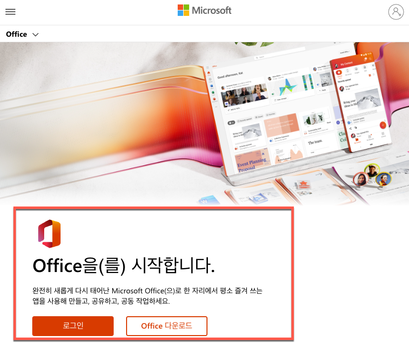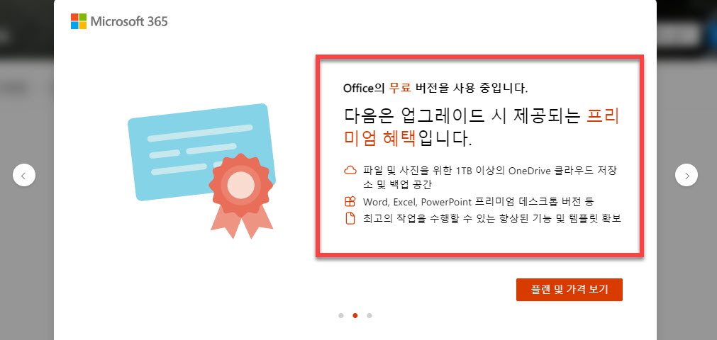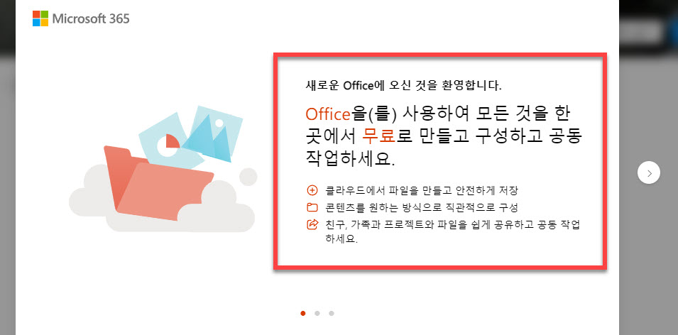 회원가입까지 완료하셨다면 오피스를 무료로 사용할 있는 부분에 대한 간단한 설명이 표시가 됩니다