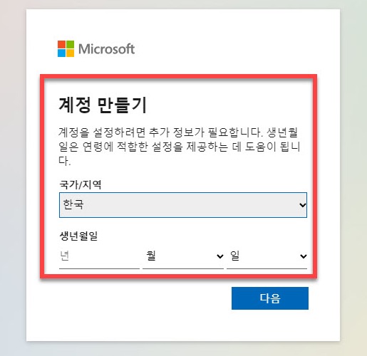 한국에서 사용하는 분들은 국가 선택과 생년월일은 각각 선택 입력 후 <다음> 버튼을 클릭하여 회원가입에 필요한 이후 과정의 페이지로 이동을 합니다