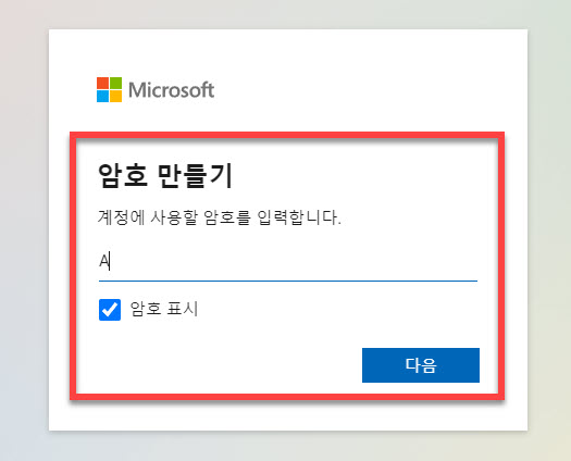 MS 계정에서 사용할 비밀번호를 입력하는 곳에서는 <암호표시> 를 클릭하여 사용자가 입력하는 암호를 눈으로도 확인하여