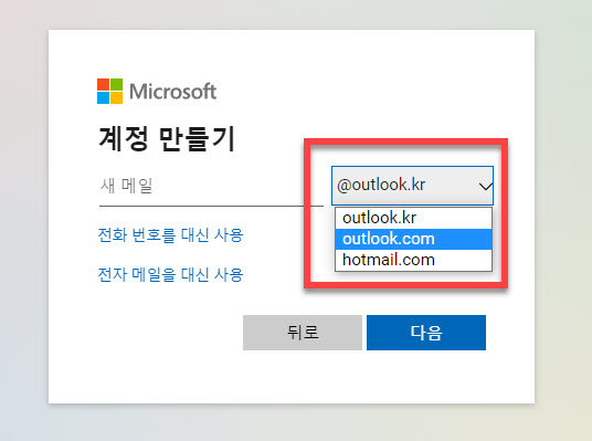 마이크로소프트에서 제공하는 메일 계정은 화면 팝업 리스트에 있는 것과 같이 <outlook.kr> , <outlook.com> , <hotmail.com> 의 주소를 지원합니다
