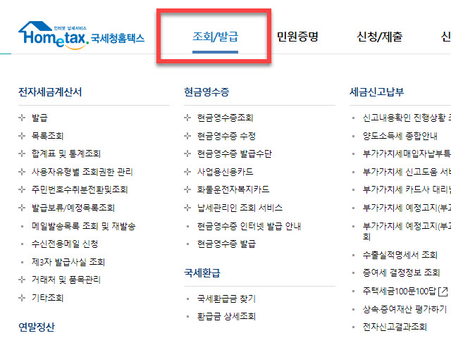 로그인을 완료하셨다면 홈페이지 윗부분에 있는 메뉴 목록의 가장 첫번째에 있는 <조회/발급> 으로 마우스 커서를 이동을 합니다