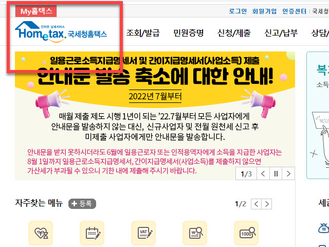 홈텍스에 가입되어 있는 계정으로 로그인 과정이 필요하기 때문에 홈페이지 상단에 있는 <로그인> 을 마우스로 클릭하시면 됩니다