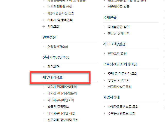하단으로 펼쳐진 다양하고 지금 당장은 나와는 상관없을 거 같은 제공 서비스를 뒤로 하고 아래로 시선을 이동하면 <세무대리정보> 를 찾을 수 있습니다