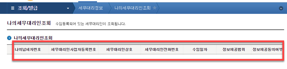 해당 하위 메뉴 속에는 “나의세무대리수임동의”, “나의신고대리수임동의” 아래에 있는 <나의세무대리인조회> 텍스트 메뉴 링크를 클릭하시면 우리가 필요한 정보를 찾을 수 있게 됩니다