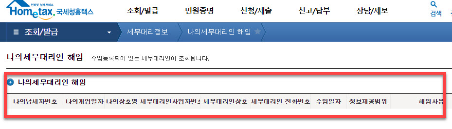 현재 세무대리인으로 홈텍스에 등록되어 있는 곳에서 해임을 하기 위해서는 세무대리인 정보를 찾았던 방법과 동일하게 <조회/발급> 메뉴에 있는 세무대리 정보 항목 밑의 <나의세무대리인 해임> 메뉴를 찾아 이동을 하시면 됩니다
