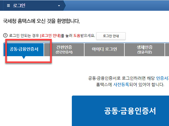 업무용으로 국세청 홈페이지를 사용하시는 분들은 아이디와 비밀번호를 입력하여 로그인하는 방법보다는 공동 금융인증서를 활용하여 로그인하는 방법이 더 익숙한 점과 홈텍스 회원가입 시 만들었던 아이디와 비밀번호를 이용하는 접속보다는 상대적으로 기능 제한이 없었다는 경험을 다른 업무 관련 사이트에서 겪어 보셨다면 <공동 금융인증서> 로그인을 선택하여 진행하게 됩니다