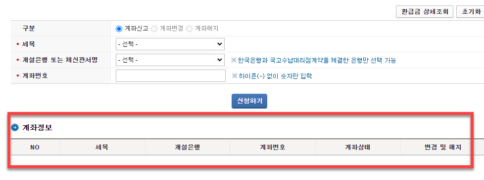 환급 신청 페이지의 화면구성에서의 1번째 영역의 <구분> 항목은 <계좌신고> 가 기본 설정으로 되어 있습니다