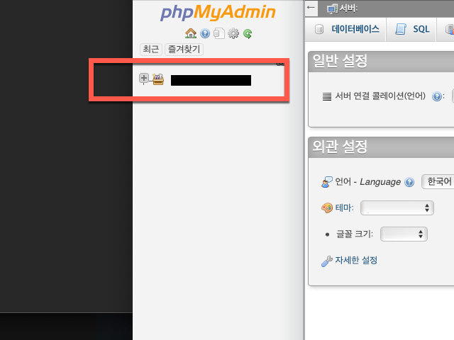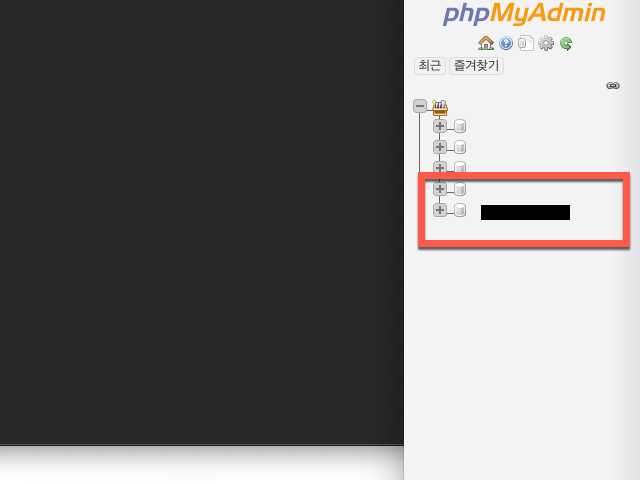 phpMyAdmin 를 실행하면 처음 계정을 만들 때 도메인명을 사용하는 경우와 랜덤으로 무작위로 생성된 계정명 인 경우에 따라서 화면의 빨간색 테두리 안에 있는 텍스트가 각각 사용자마다 다르게 표시가 됩니다