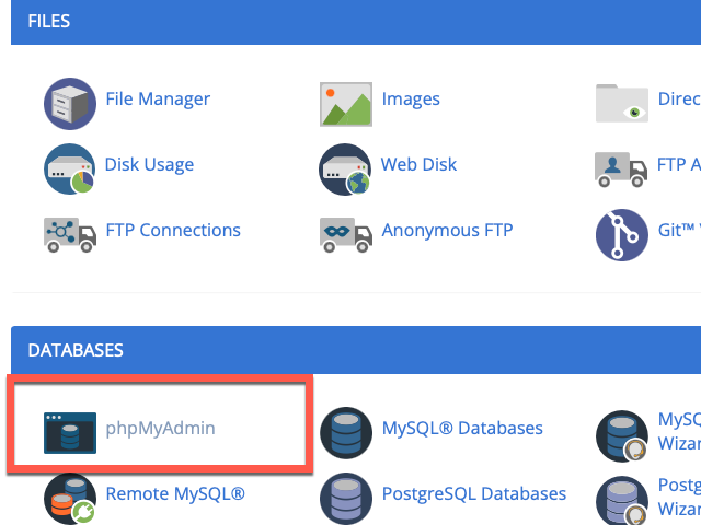 EMAIL, FILES, DATABASES, METRICS, SECURITY, SOFTWARE, ADVANCED, PREFERENCES, SOFTACULOUS APPS INSTALLER 의 9가지 파란색 분류 목록 중에 <Databases> 카테고리에 포함되어 있는 <phpMyAdmin> 을 실행하여 필요한 정보를 찾는 작업을 진행해야 합니다