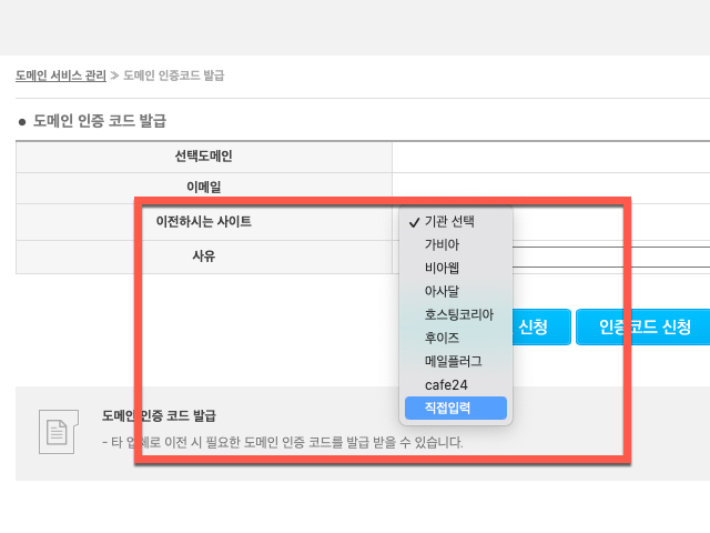 가비아, 바이웹, 아사달, 호스팅코리아, 후이즈, 메일플러스, cafe24 의 7개 도메인 기관 중에 없다면 아래에 있는 <직접입력> 을 선택하여 기입해주셔야 합니다