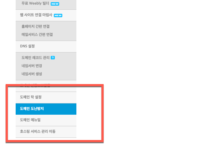 도난방지가 설정되어 있는 도메인이라는 정보를 미리 알고 있는 경우에는 좌측 메뉴에서 <도메인 도난방지> 를 1번째로 선택하여 작업을 준비할 수 도 있습니다