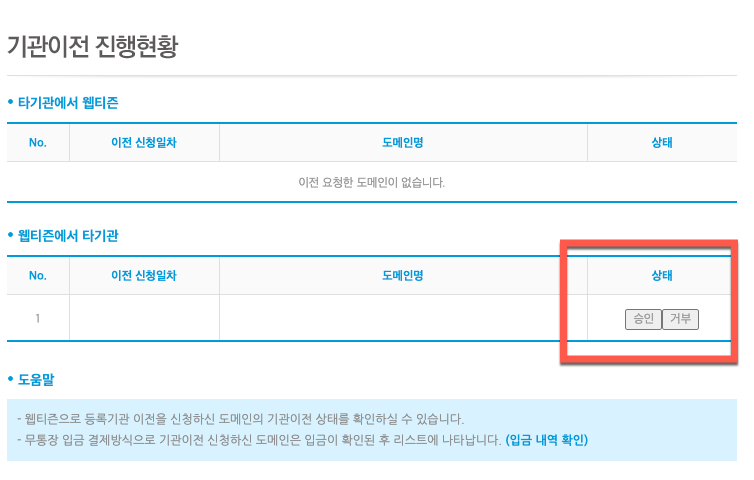 이곳에서는 타 기관에서 웹티즌으로 도메인을 이전하는 경우와 웹티즌에서 타기관으로 도메인 주소 관리를 변경 신청된 2가지 경우 모두 이곳에서 신청 접수 상태와 이전 신청 일자의 정보를 함께 확인할 수 있습니다
