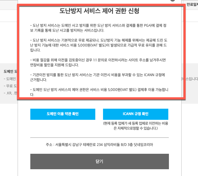 이곳에서 상태 값 ON 을 비활성화로 변경하기 위해서는 도메인 이름 앞에 있는 체크 표시를 선택 후 아래에 있는 <도난방지 기능제어 신청(유료)> 를 선택하는 필수 작업이 필요하도록 안내되고 있습니다