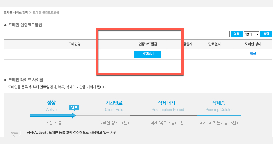 웹티즌에서 관리하고 있는 도메인이 2개 이상이라면 새로운 도메인 관리기관으로 옮기려는 도메인을 재 확인 후 <인증코드 발급> 항목 아래에 있는 <신청하기> 버튼을 클릭하여 다음 단계로 작업을 이동하게 됩니다