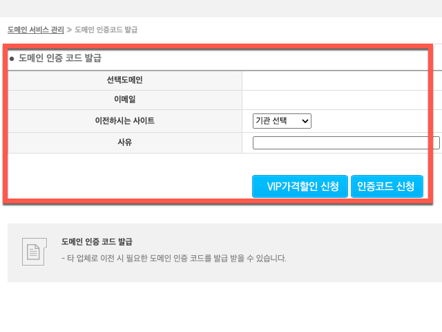 좌측 메뉴에서는 이사하려는 도메인 관리 사이트에서 필요로 하는 인증번호를 받기 위해서는 <도메인 인증코드 발급> 메뉴를 선택하여 진행할 수 있습니다