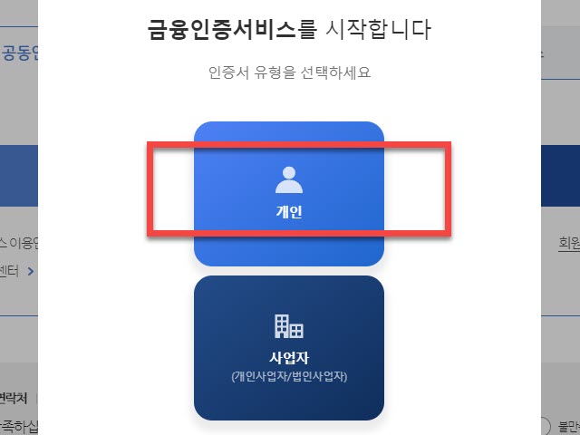 금융인증 서비스를 선택하면 개인사업장과 법인 사업자의 회사와 관련된 경우가 아닌 일반 개인에 대한 서비스 이용을 사용하는 분들은 상단에 있는 <개인> 을 선택해 주시면 됩니다