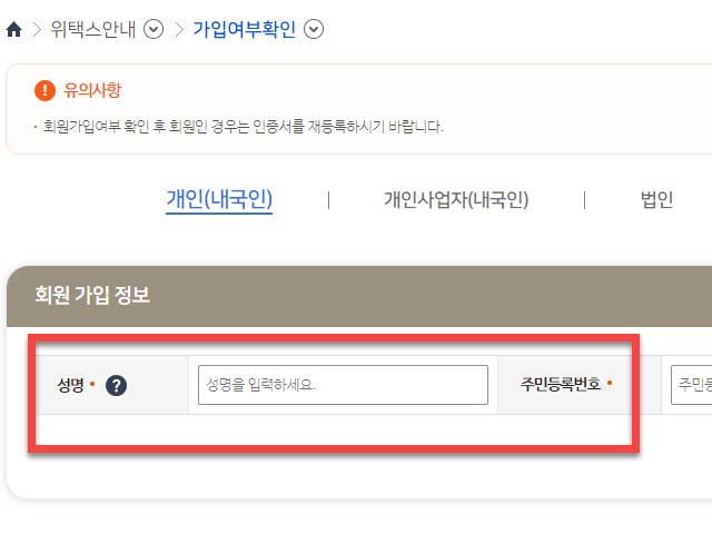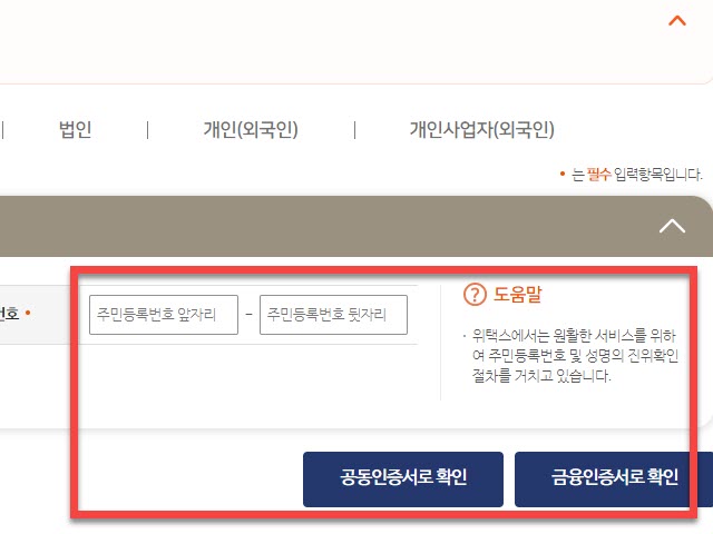 회원가입이 필요한지, 현재 등록되어 있는 회원인지의 여부 확인이나 로그인하였던 인증서가 사이트에 등록된 내용인지 살피기 위해서 개인, 개인사업자, 법인 등의 구분을 선택하여 이름과 주민등록번호 등의 개인신상 정보를 입력한 다음