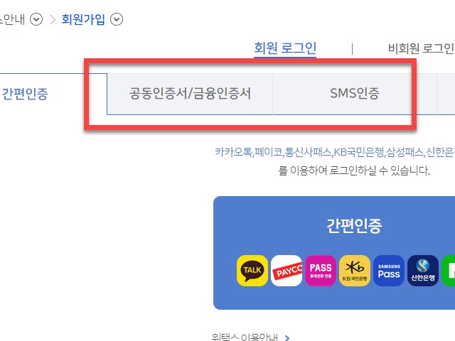 회원로그인을 선택하시면 카카오톡, 네이버, 신한인증서, 페이코, 삼성패스, KB모바일 인증서 그리고 휴대폰 업체 통신사에서도 제공하는 “통신사패스” 의 7개의 <간편인증> 방법을 사용할 수 있도록 가장 첫 번째 탭에 배치가 되어 있습니다