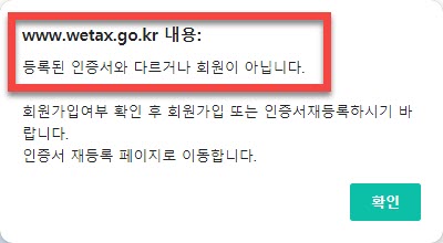 빨리 지방세의 납부 or 신청을 처리하고 싶은 사용자의 마음과 달리 비대면 환경의 인터넷 접속 시 본인이라는 증명을 하는 인증서로 로그인을 했지만, 등록된 인증서와 다르거나 회원이 아니라서 회원가입 확인 후 새로운 회원가입이나 인증서 재등록을 해야 한다는 팝업 메시지 창을 만날 수 도 있습니다