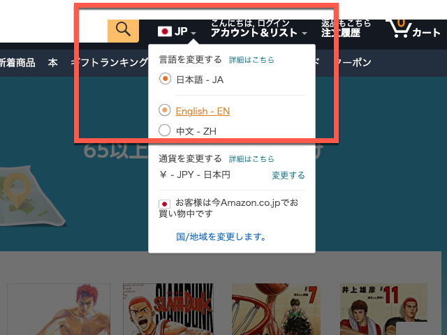 일본어로 표시되는 처음 초기 보이는 아마존 회원 로그인 버튼이 있는 메뉴 옆에 있는 일본 국기 아이콘으로 마우스를 움직여 보이는 숨은 메뉴 목록에서 현재 기본 설정되어 있는 日本語 -JA 의 선택을 <English - EN> 으로 변경하여 영어로 선택하는 방법이 더 쉽게 아마존 재팬에서 쇼핑을 할 수 있는 거 같았습니다