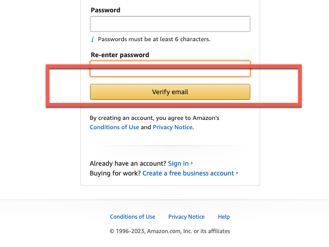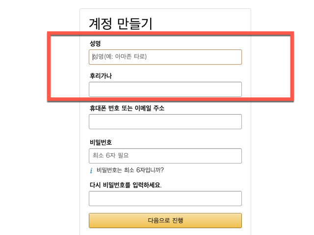 아마존 사용을 위한 계정 생성에 필요한 You name과 Re-enter your name 영역에는 자기 이름을 영어로 반복하여 입력과 함께
