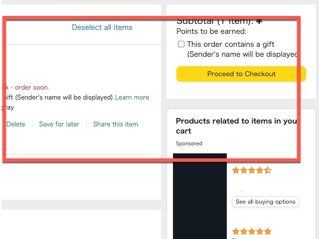 <Proceed to Checkout> 버튼을 눌러 결제 단계로 넘어갈 수 있지만, 필요한 경우에는 좌측에 있는 메뉴인 삭제(Delete), 나중에 구입하기 위해 찜 용도로 사용할 수 있는 Save for later 를 사용할 수도 있습니다