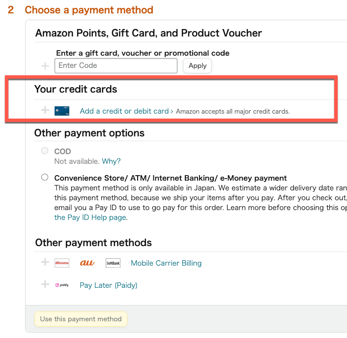 2번째 결제 지불 수단를 선택에서는 대부분 사용하게 되는 신용카드로 "Your credit cards" 를 선택하게 됩니다