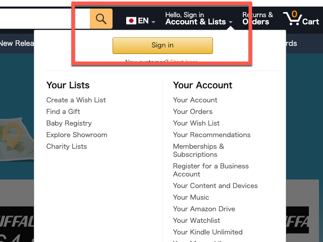 일본 국기는 유지되면서 옆에 표시된 언어는 영어로 적용된 모습에서 로그인이나 회원가입을 할 수 있는 영역으로 이동하면 Sing in 아래에 있는 <New customer? Start here> 를 선택하여 시작할 수 있습니다