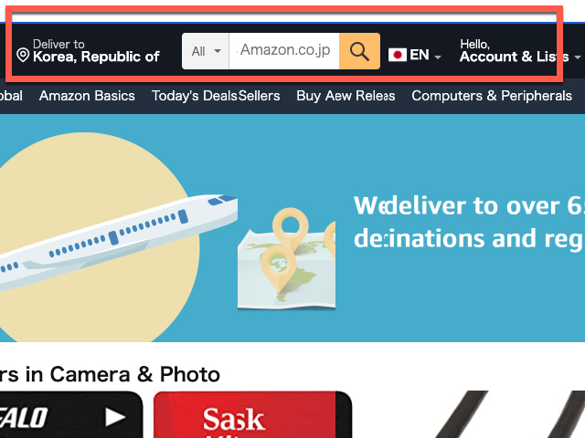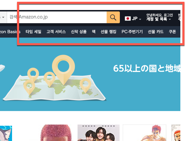 한국에서 일본 아마존 온리인 인터넷 쇼핑몰 홈페이지를 방문하면 사이트 좌측 amazon 이름 옆에 는 접속한 지역을 배송지로 대한민국으로 표시가 되는 상태를 확인할 수 있습니다
