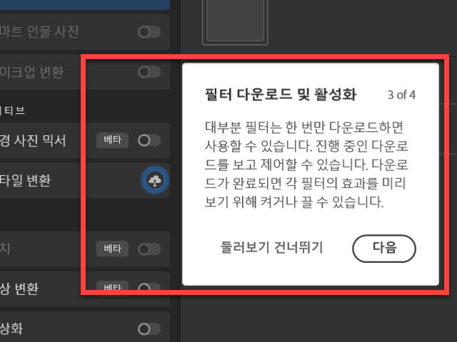 제공되는 필터 중 구름 모양의 아이콘으로 표시되어 있는 경우에는 다운로드를 하여 PC에서 사용할 수 있도록 활성화가 필요한 내용도 친절하게 설명하고 있습니다